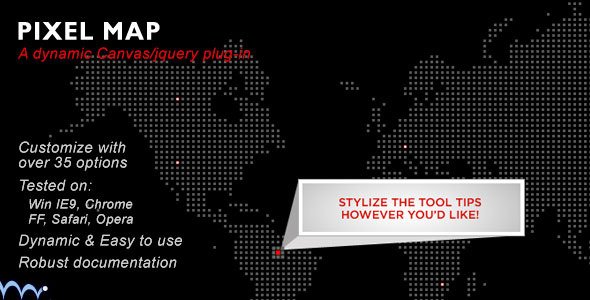 Use this pixel map as a great way to interact with you global customer base. Use any stylized image as tool tips or simple HTML text, and let the map do the rest.